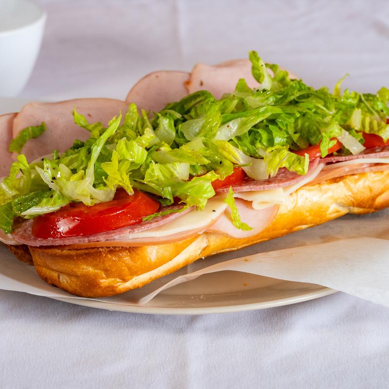 Ham, salami, provolone, lettuce, tomato, mayo, Italian dressing.